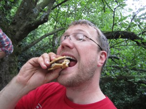 A s’more (so as spelled due to ones desire to have “some more” or s’more) is an American camp fire treat born out of a union between pyromania and chocolate. The traditional ritual involves a group of individuals (generally under “adult” supervision if children are involved) gathering around a large flame – usually a bonfire, campfire, or bbq grill. Taking sharp-pointed sticks they impale large white marshmallows and thrust them at the open flame, setting them alight. Once sufficiently blackened (or in several cases, coming dangerously close to burning the sharp stick clean off) the marshmallow is cooled (as in, no longer alight) and then placed on top of a portion of a bar of chocolate which has been placed on a portion of a graham cracker. The other portion of the graham cracker is then placed on top of all this, allowing a “clean” stick removal from the marshmallow and thereby creating a sandwich which consists of 95% sugar.