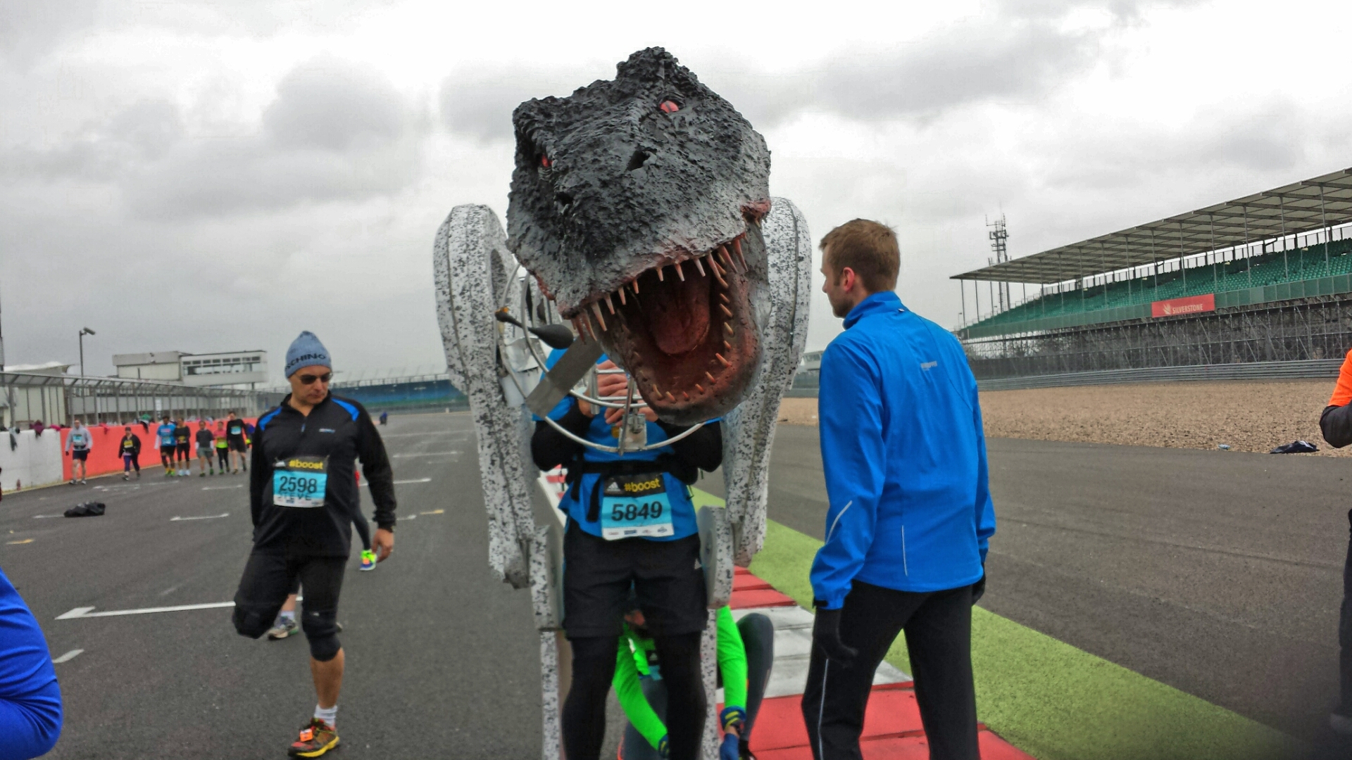 On that Mother’s Day, all that time ago, I stood alone and freezing on a race track I knew so little about. Fast forward and yesterday, also a Mother’s Day, I stood freezing with a dear friend who had never run beyond 7 miles and a fully grown male in a tyrannosaurus rex costume.